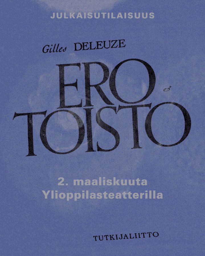 Eron ja toiston, Gilles Deleuzen ensisijaisen väitöskirjan, suomennoksen julkistamista juhlitaan 2. maaliskuuta Helsingin Ylioppilasteatterilla osoitteessa Aleksanterinkatu 23.