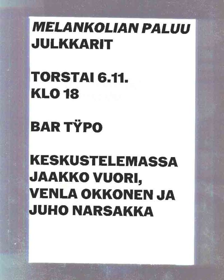 Julkkareita vietetään 6.11 klo 18 Tekstin talolla, jossa Juho Narsakka, Venla Okkonen sekä esseen kirjoittanut Jaakko Vuori keskustelevat melankolian, nykykapitalismin ja kirjallisuuden kytköksistä. Vuoren filosofis-kirjallinen essee sukeltaa melankolian kaksituhatvuotiseen kulttuurihistoriaan.
